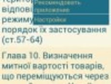 Таможенный кодекс Украины 4.0.6 для Android - Приложение содержит в себе статьи из таможенного кодекса Украины. Таможенный кодекс Украины определяет основы организации и осуществления таможенного дела в Украине, регулирует экономические, организационные, правовые, кадровые и социальные аспекты деятельности таможенной службы Украины. Таможенный Кодекс направлен на обеспечение защиты экономических интересов Украины, создание благоприятных условий для развития ее экономики, защиты прав и интересов субъектов предпринимательской деятельности и граждан, а также обеспечения соблюдения законодательства Украины по вопросам таможенного дела.