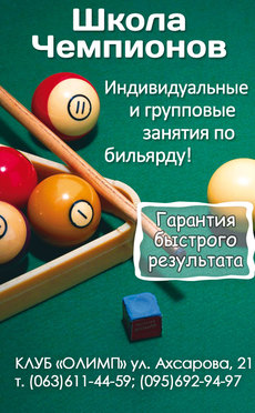 Бильярдный зал клуба «Олимп» – это одно из лучших бильярдных заведений города Харькова. Для Вас мы предлагаем столы для игры в русский бильярд и пул. А также разновидности игр: Алагер, Американка, Кегли на бильярде, Малая русская пирамида, Пул 14+1 и др. phoca_thumb_l_bilchil10 img_6618 Только у нас: • профессионально оборудованный зал; • услуги маркеров; • правильное освещение; • внимательное отношение к каждому клиенту. А также: Индивидуальные занятия; Школьные и студенческие группы; Любительские турниры по бильярду (мужские, женские и детские) с призами от спонсоров; И услуги бара и ресторана.